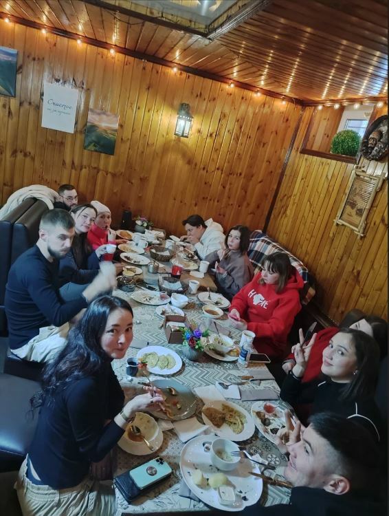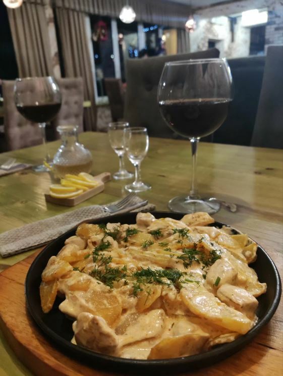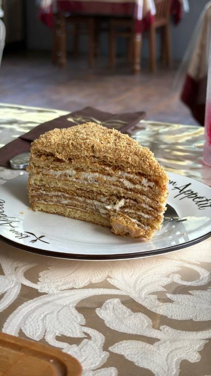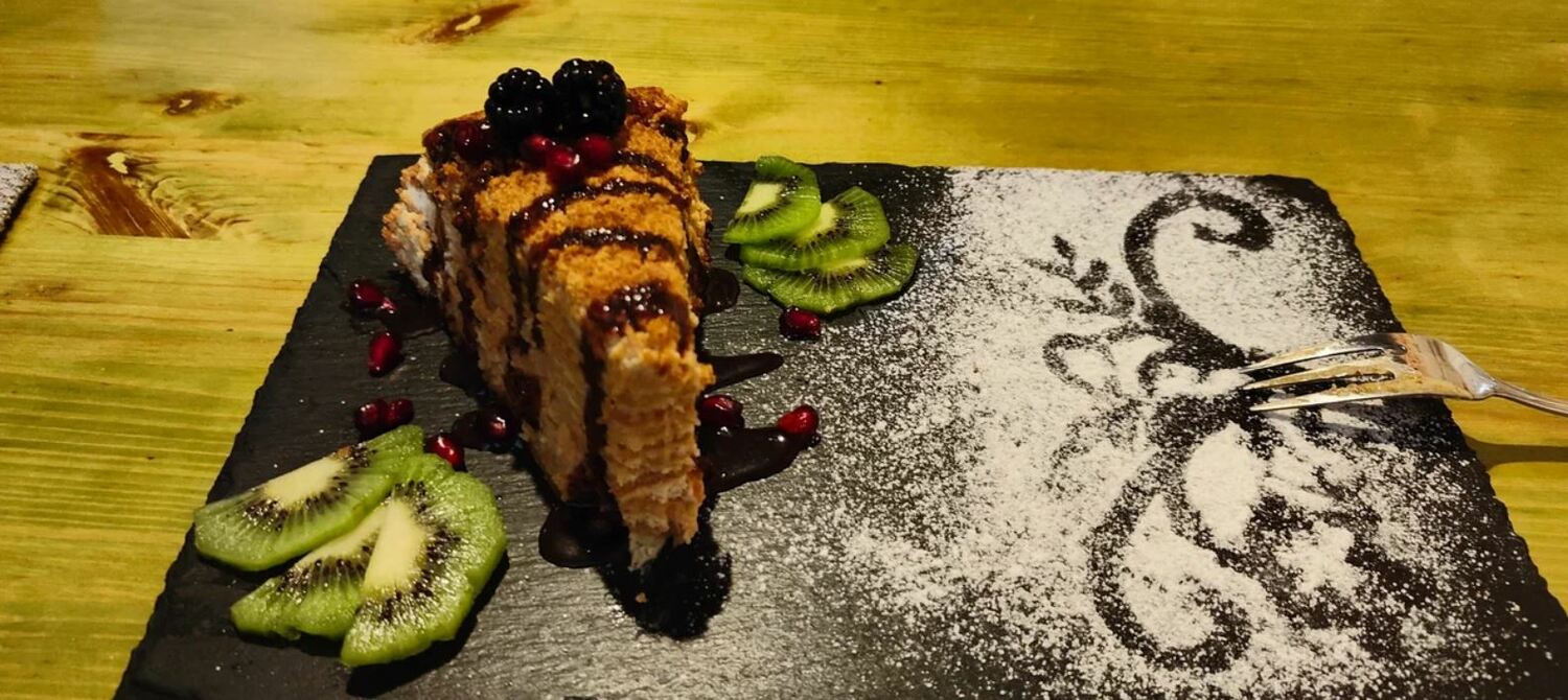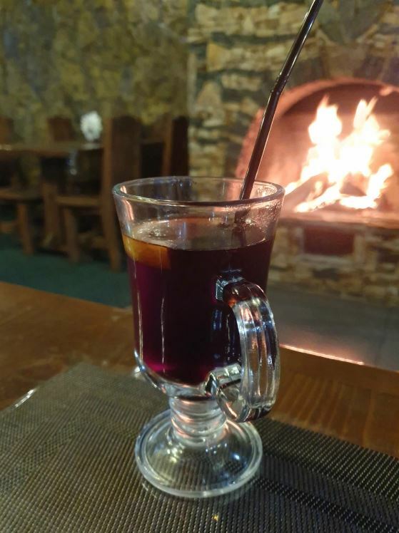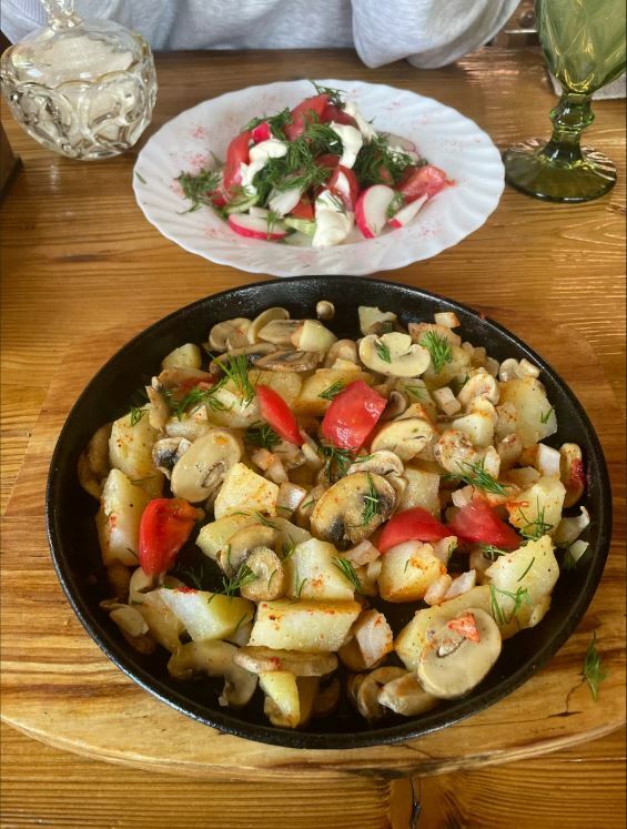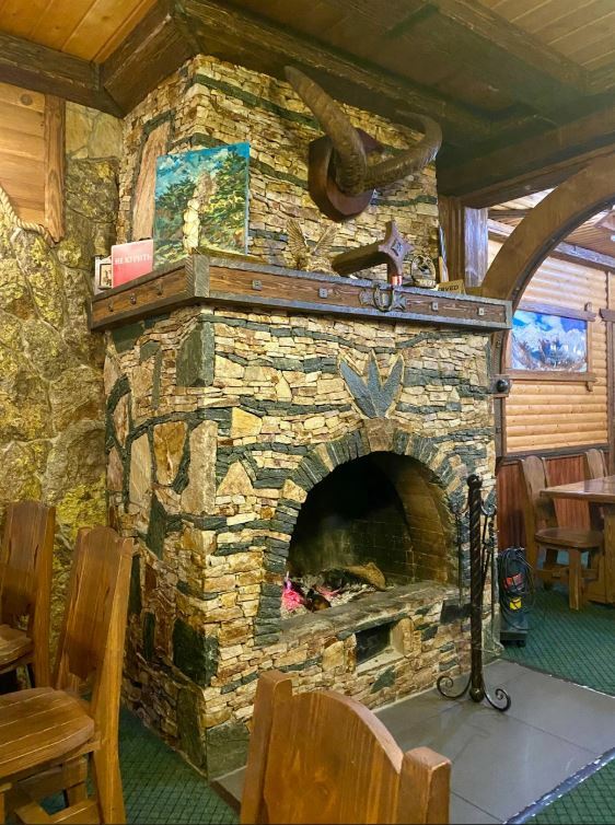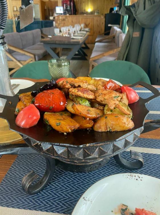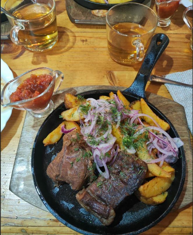 Гости рекомендуют попробовать хычины, лагман, манты, сырный суп, чебуреки с сыром и другие блюда. В кафе есть камин, который создает уютную атмосферу.