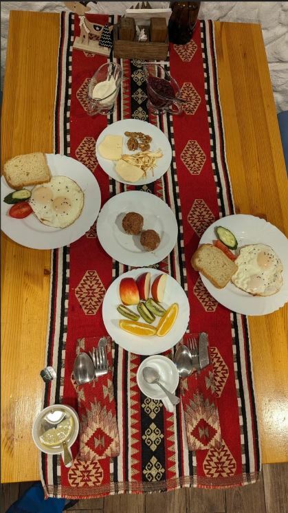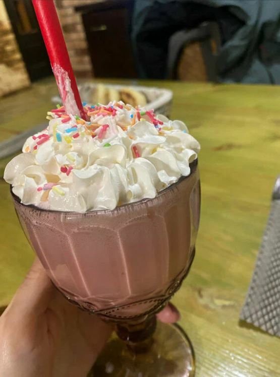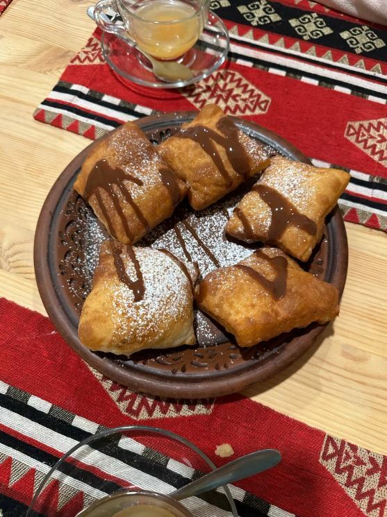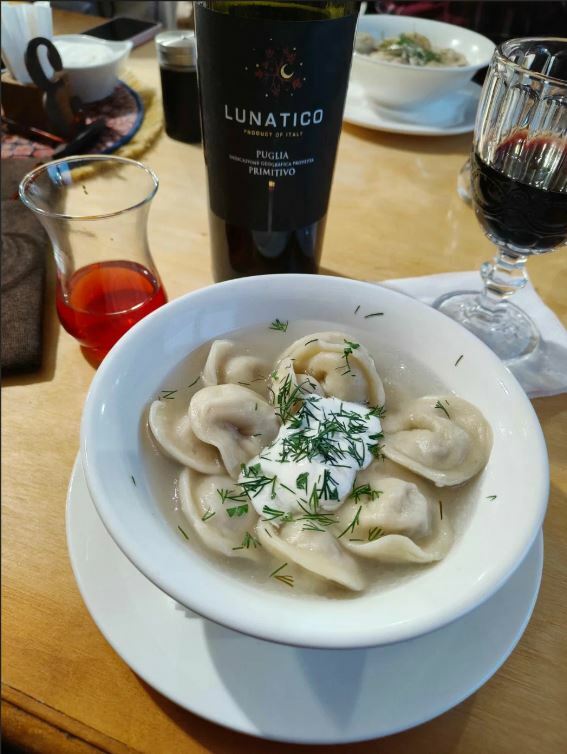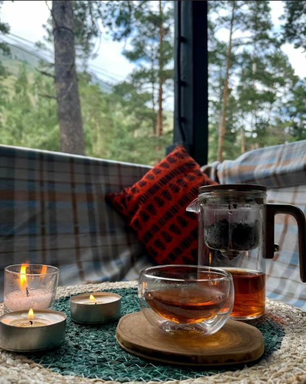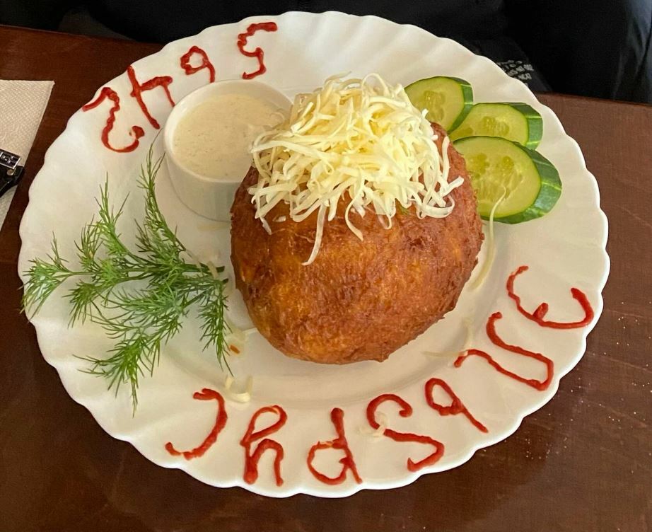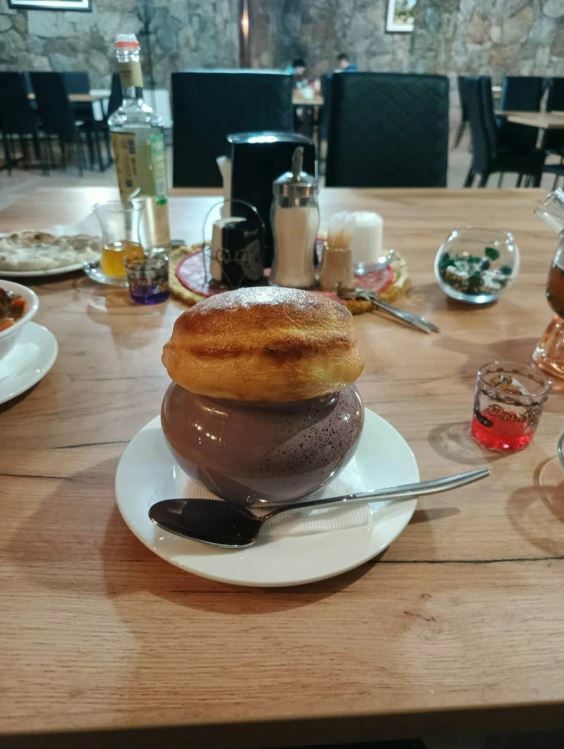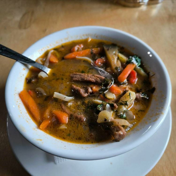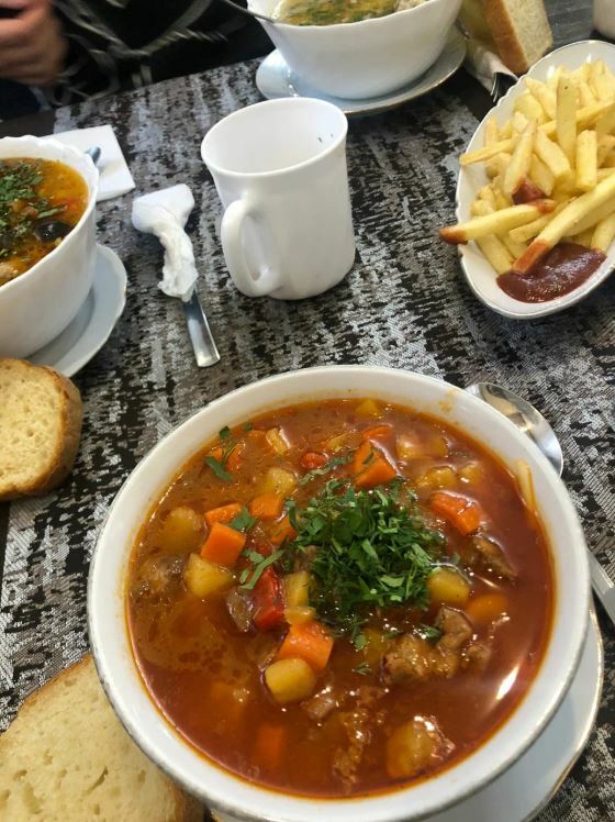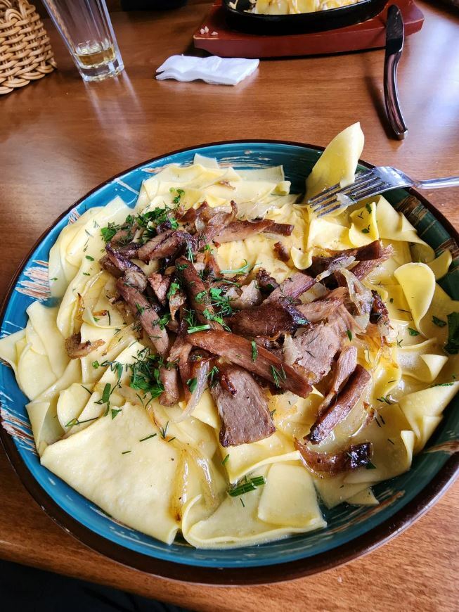 Гости рекомендуют попробовать хычины, лагман, манты, сырный суп, чебуреки с сыром и другие блюда. В кафе есть камин, который создает уютную атмосферу.