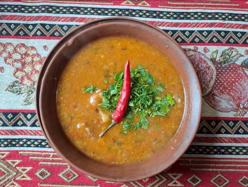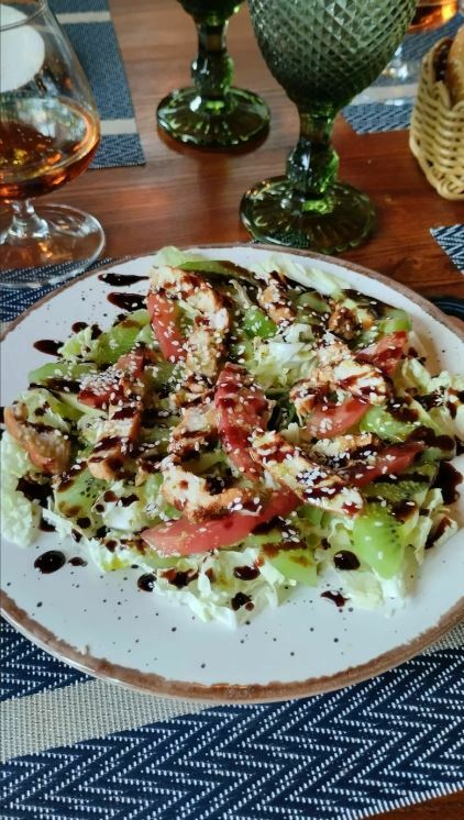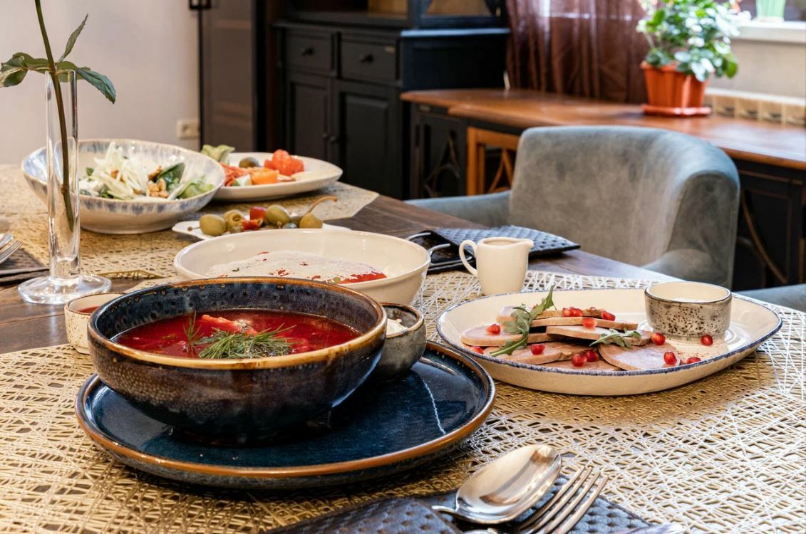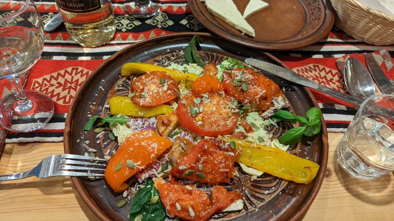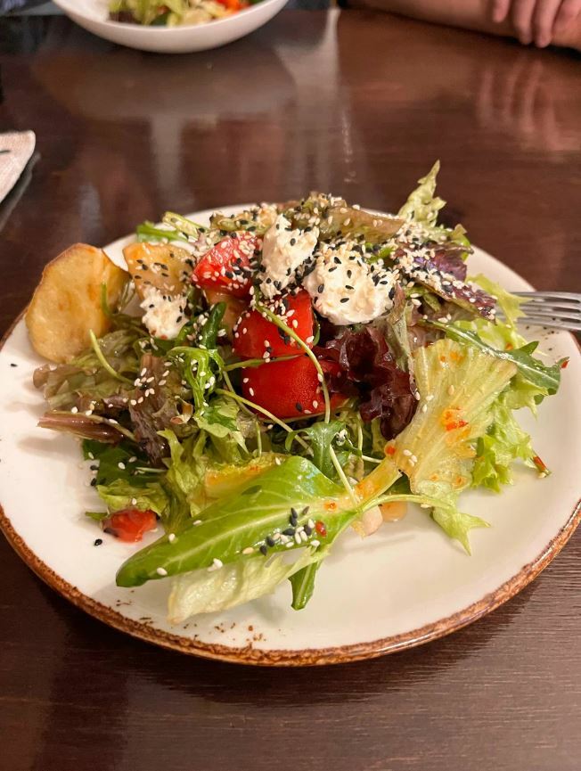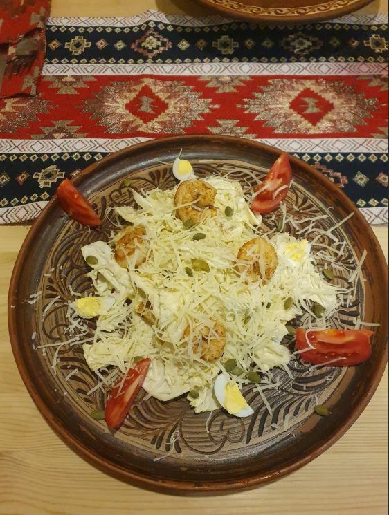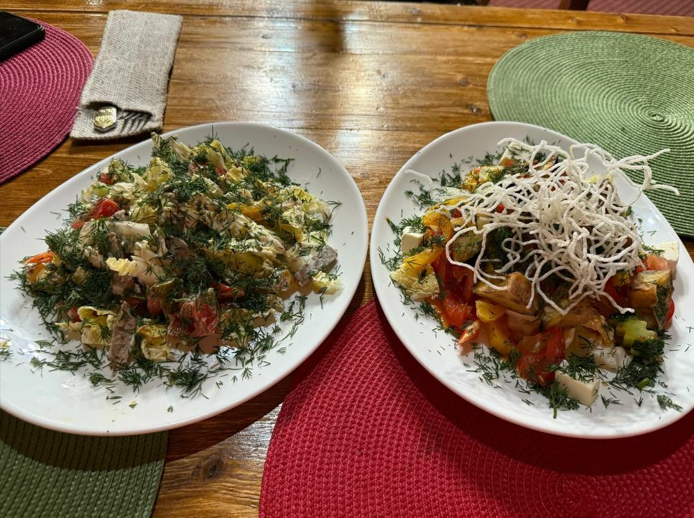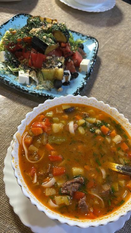Гости рекомендуют попробовать салат из хрустящих баклажанов, чанахи, шурпу, лагман, сырники, каши, кофе, чай на травах, глинтвейн и домашнее вино. Порции большие, а цены демократичные.