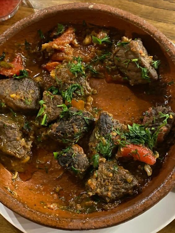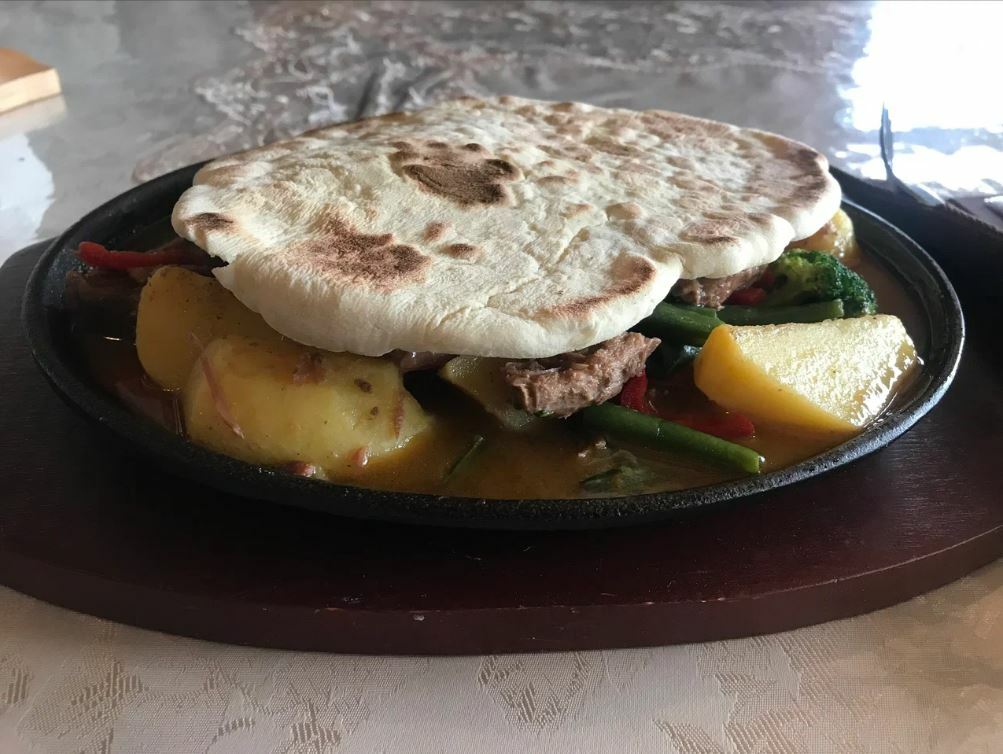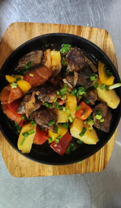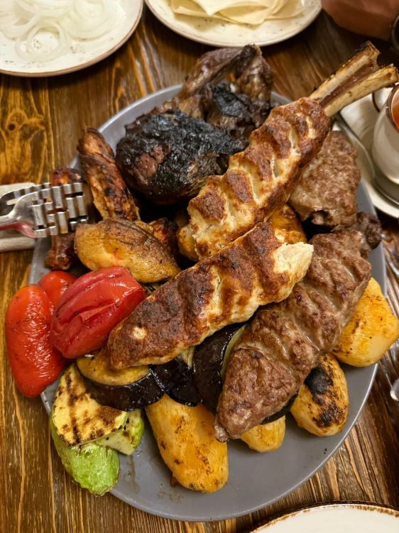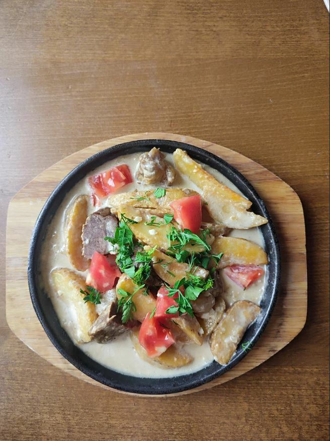 В меню представлены местные блюда, такие как жау-баур, сохта, баклажаны, манты и долма. Гости рекомендуют попробовать жаркое с говядиной, салат с баклажанами, баранину и штрудель.