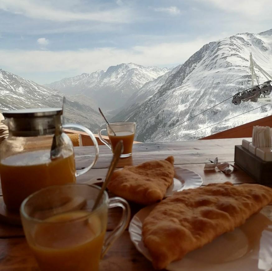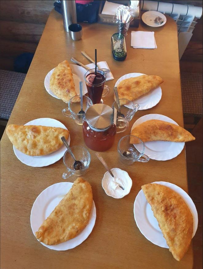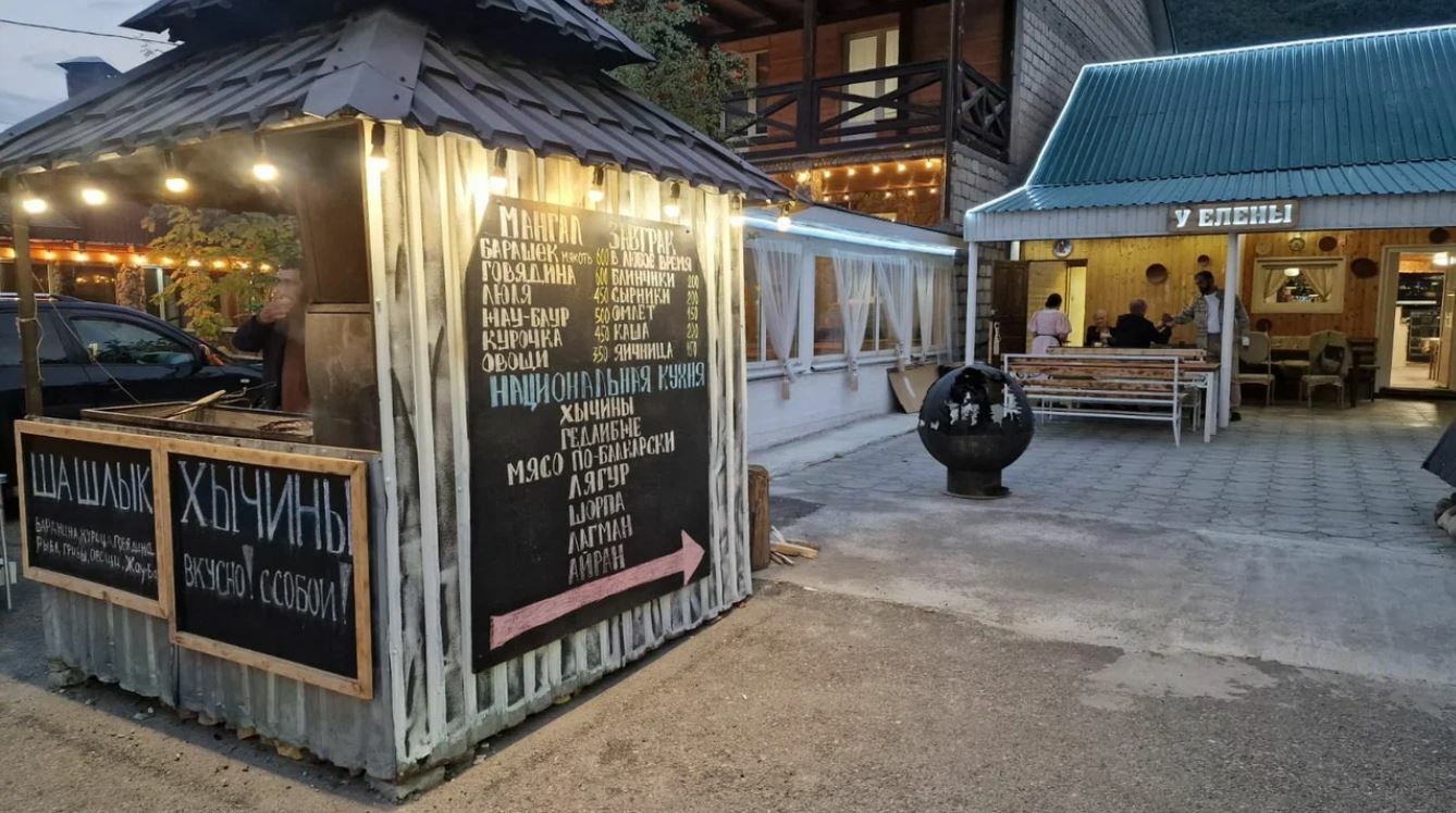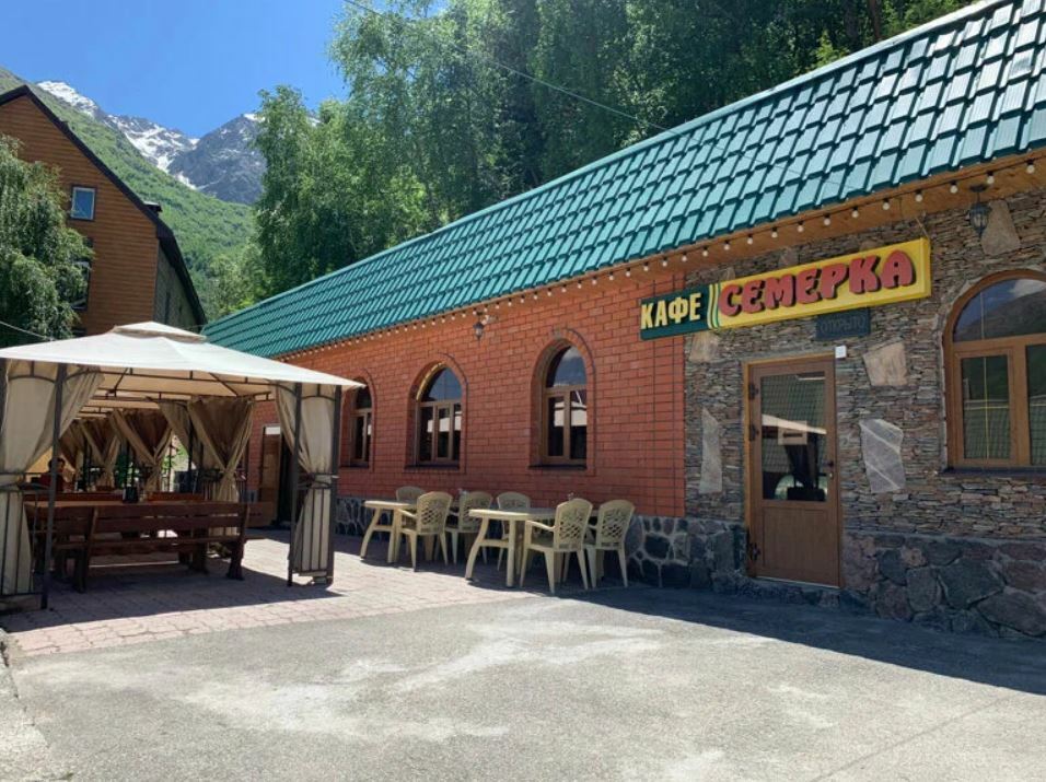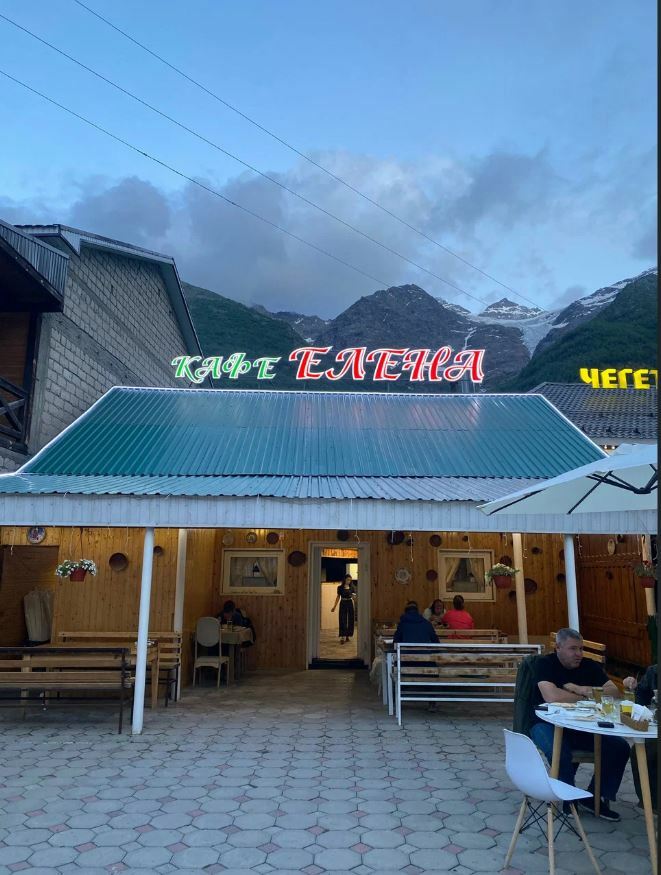 Чебуреки и правда хороши — кисло-сладкая начинка оригинальна, пикантна и гармонична. В меню классические блюда для этих мест: лагман, шурпа, хычины. Из окон кафе открывается потрясающий вид на Эльбрус и ледник «Семёрка».