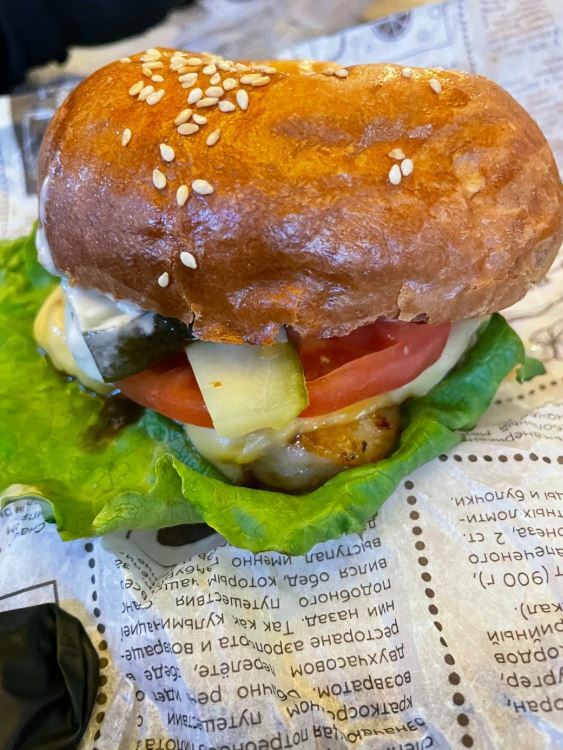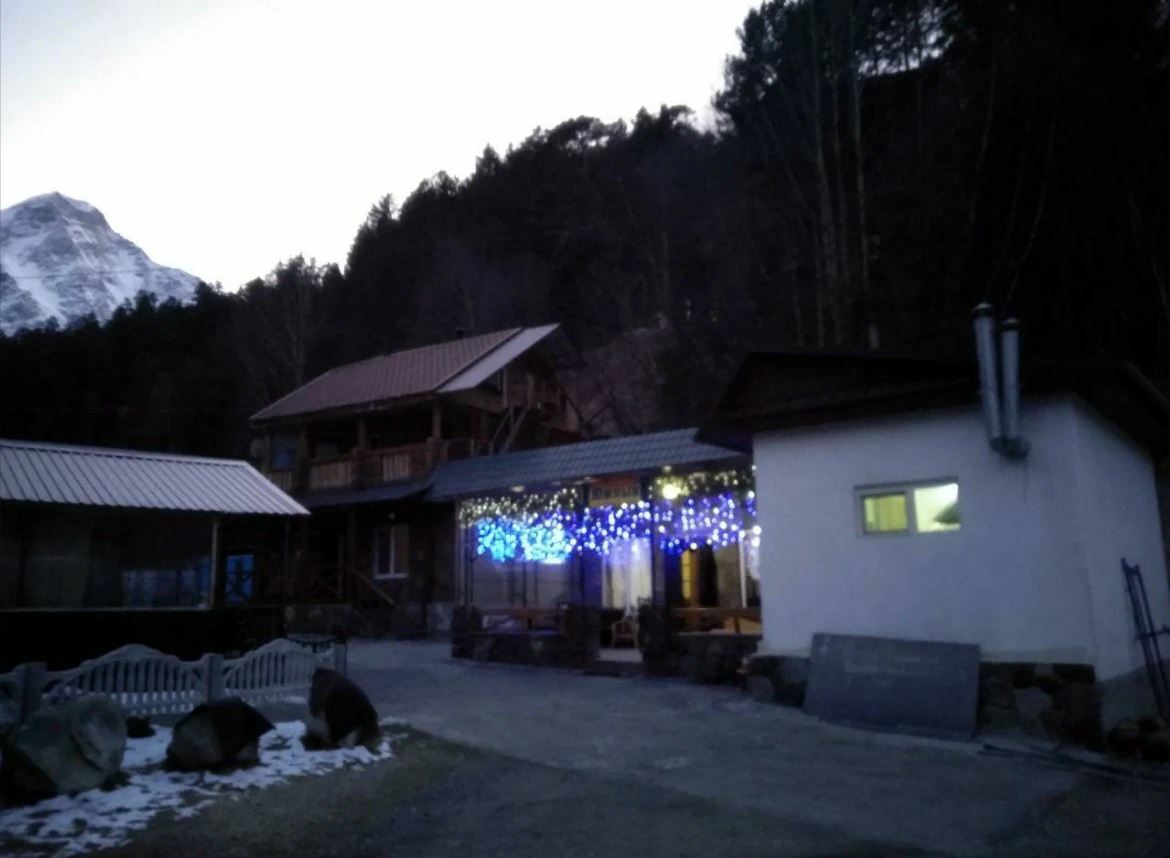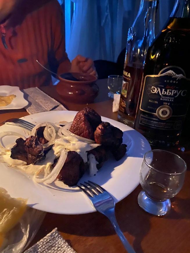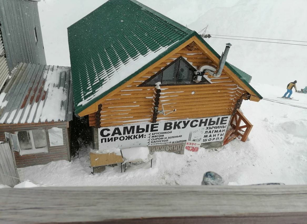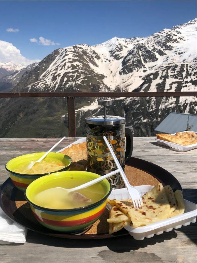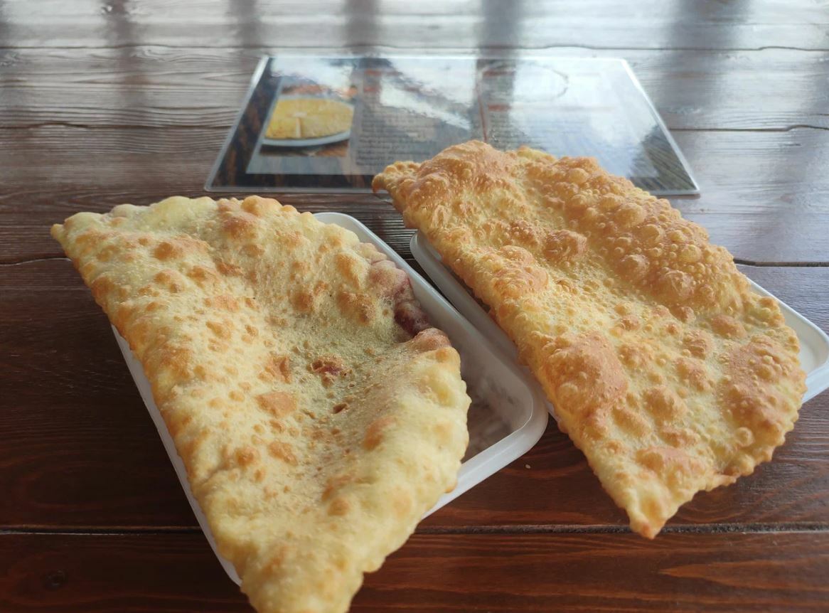 Чебуреки и правда хороши — кисло-сладкая начинка оригинальна, пикантна и гармонична. В меню классические блюда для этих мест: лагман, шурпа, хычины. Из окон кафе открывается потрясающий вид на Эльбрус и ледник «Семёрка».