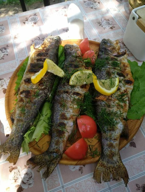 Кроме того, на территории кафе есть пруд с форелью, где вы можете поймать рыбу и заказать ее приготовление на мангале.