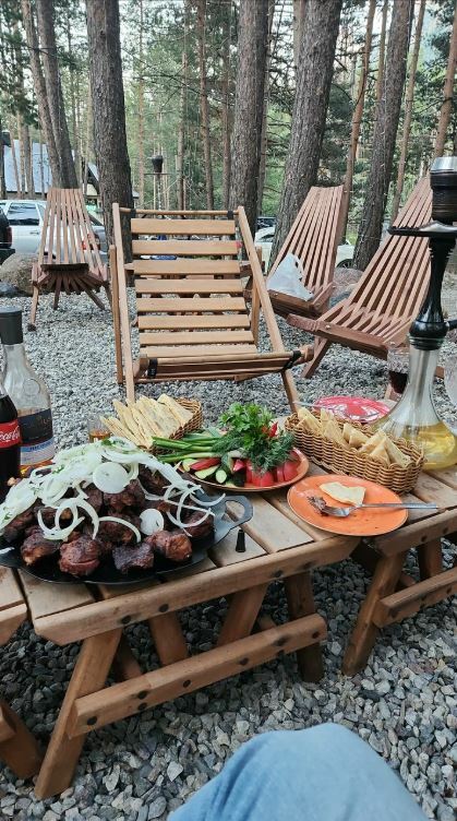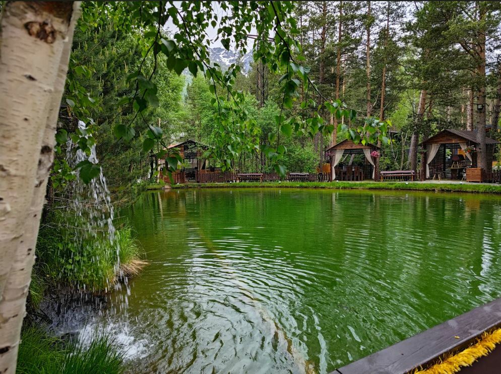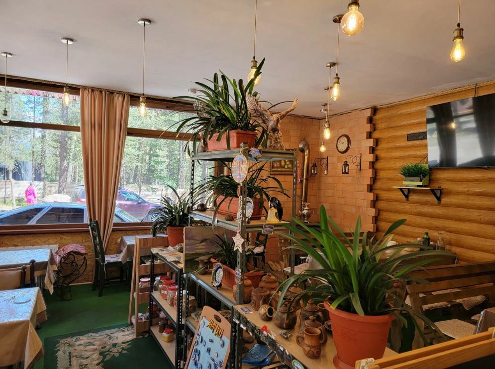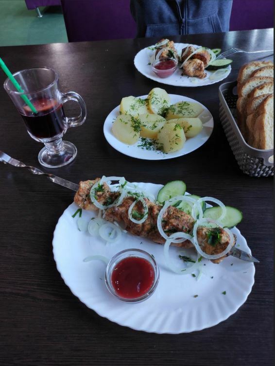 Здесь вы можете попробовать форель, чебуреки с мясом, вишней или брусникой, а также салат из баклажанов. Кроме того, в кафе есть собственный пруд с форелью, где вы можете порыбачить.