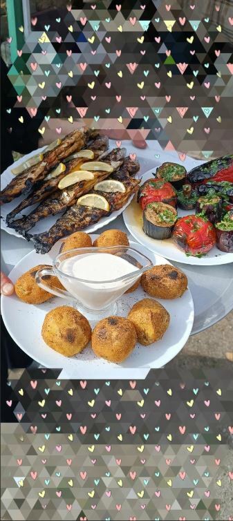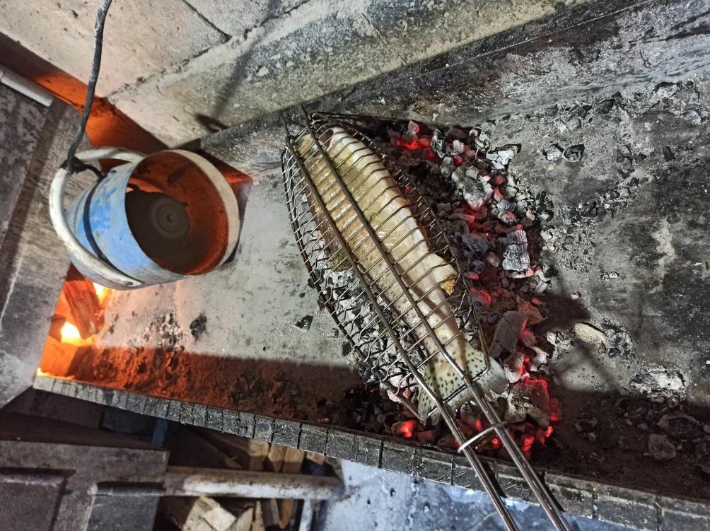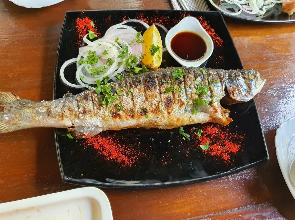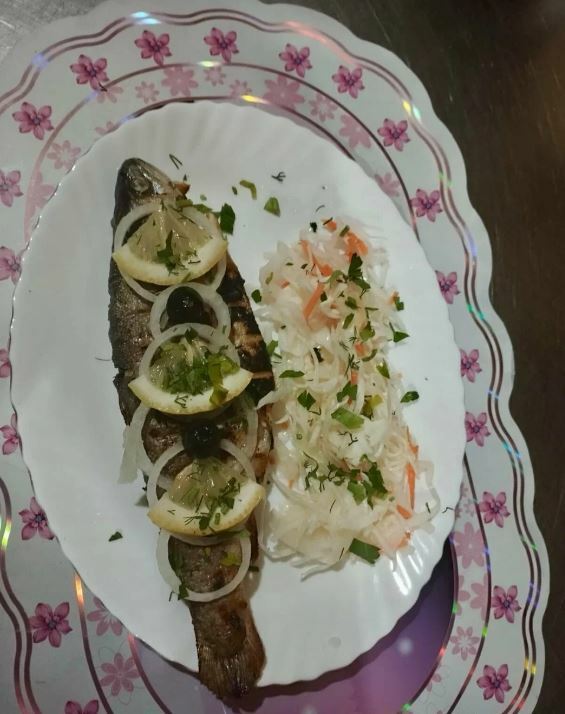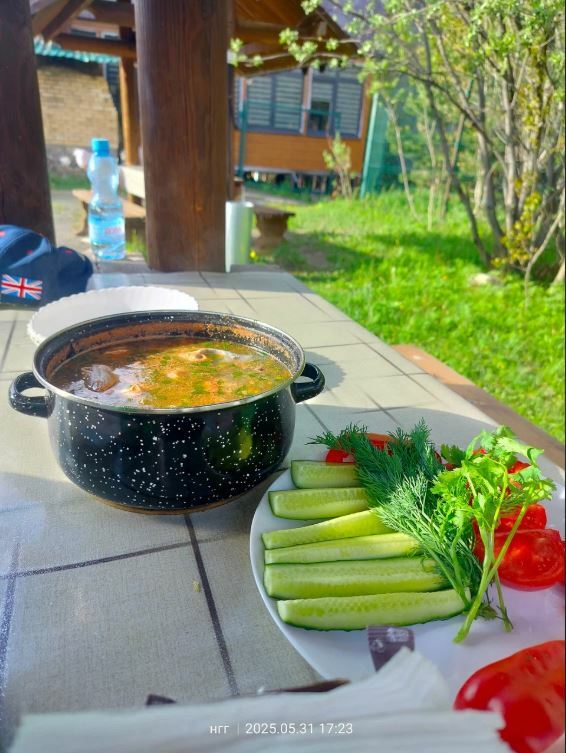 Из пойманной рыбы готовят уху и жарят ее на мангале. Кроме того, гости хвалят местные хычины и другие блюда.