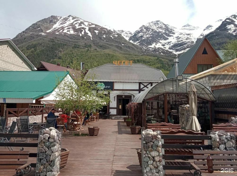 Кафе «Cheget» — это уютное заведение с прекрасным видом на горы и подъемник. В кафе есть основной зал, крытая и открытая веранды, а также летняя закрытая веранда с мягкими диванчиками и камином.