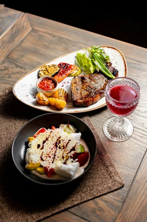 В меню представлены блюда кавказской кухни, такие как хачапури, хычины и бефстроганов, а также супы и салаты. Гости рекомендуют попробовать шоколадный фондан, кленовый пекан и штрудель. Кроме того, в ресторане можно покурить кальян.