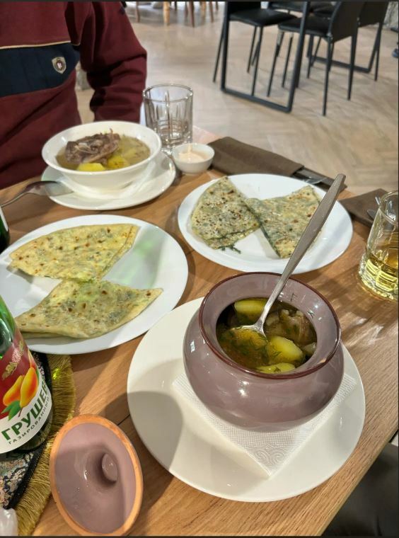 Посетители отмечают, что пирожки здесь огромные, размером с беляш, и что они заслуживают отдельного внимания. Кроме того, в меню есть хычины, лагман, шурпа и чай из горных трав.